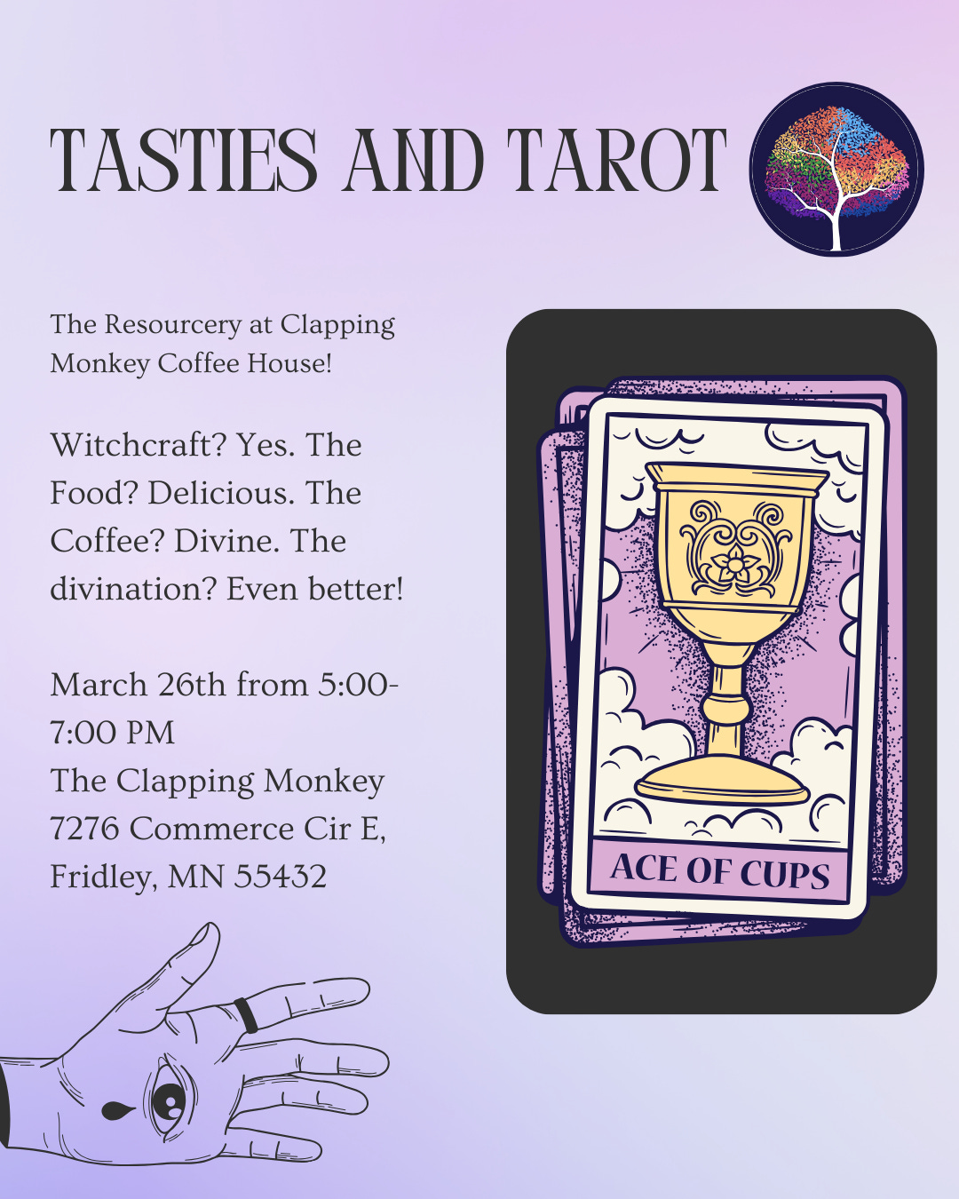 Flyer for Aster’s in person event, with the rainbow tree logo for The Resourcery in the upper left hand corner, event details, the Ace of Cups tarot card with a golden cup on a purple and white cloud background, and a hand in the lower left corner with a ring on the index finger and eye in the palm.