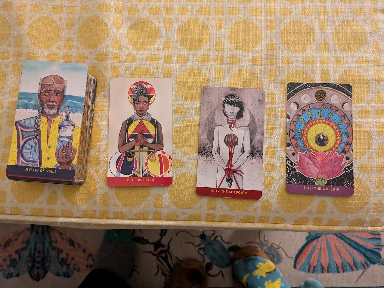 Picture of that fateful card pull, of Justice, a person holding scales with beautiful braids with orange and yellow circles containing colorful geometry on each side of the scale, The Shadow, traditionally known as the Devil, a humanoid figure with a white crown (adjacent to a crown of thorns), and red ties around their neck, through a hole in their chest, and around their hands, The World, a lotus blooming underneath concentric circles containing different imagery of nature including plants and moon cycles. The shadow card (far left), is The Mystic of Vials, traditionally the King of Cups, a person with grey hair on the sides of their head and in a braid, a beard, with a scarred eye, a tunic reminiscent of traditional African clothes, holding a bottle with a storm inside, with an ocean behind them.
